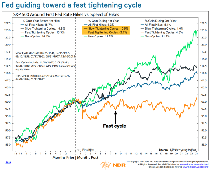 Clissold and Thanh Nguyen, NDR's senior quantitative analyst, detailed the difference between market performance in "fast" versus "slow" cycles in a Feb. 9 note. They found that in the year following the initial rate increase, the S&P 500 SPX,